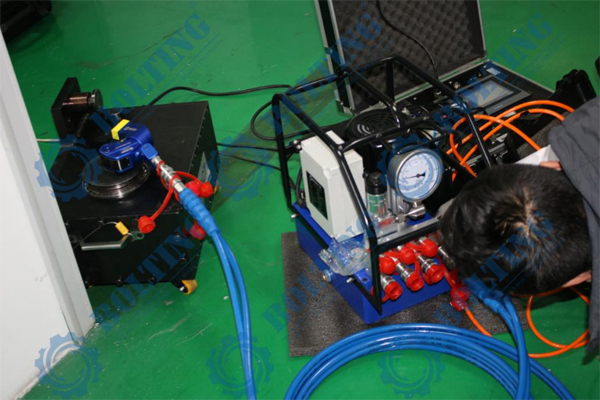 液壓扭力扳手第三方扭矩校驗檢測,理論上液壓扭力扳手檢測標(biāo)定與液壓泵的型號和流量無關(guān),液壓扭力扳手泵經(jīng)過校正壓力表,均可對液壓扭力扳手進行檢測,經(jīng)過長期及大量的實踐證明,液壓泵的流量與扭矩大小息息相關(guān),舉例說明,BOLTING博霆PE55液壓扭力扳手泵和BOLTING博霆PE110液壓扭力扳手泵,采用同一塊經(jīng)過校驗壓力表,分先后順序緊固一顆螺栓,由PE55液壓扭力扳手泵配套液壓扭力扳手先進行緊固,達(dá)到設(shè)定壓力后(300bar),擰不動了,換PE110液壓扭力扳手泵,壓力同樣設(shè)定300bar,壓力相同,螺栓同樣可以轉(zhuǎn)動,反之,采用PE55液壓扭力扳手泵,配合此扳手,壓力設(shè)定到300bar,確無法松動螺栓,配PE110液壓扭力扳手泵可輕松拆卸此螺栓,得出結(jié)論,液壓扭力扳手在工作過程中,需克服摩擦力,雖然液壓扭力扳手無沖擊性,但流量決定可以克服多少摩擦力,液壓扭力扳手怎樣檢測更精準(zhǔn)?市場上部分廠家流量與扭矩存在虛標(biāo)成分(電動液壓泵流量檢測最簡單方式,可采用單向閥裝置連接液壓油管,將液壓泵調(diào)整至所需檢測的壓力流量,每分鐘溢出的油量則是液壓泵流量,測流量裝置BOLTING博霆有售),計量院或第三方檢測機構(gòu)所采用的液壓泵型號不盡相同,采用購買液壓扭力扳手配套的電動液壓扭力扳手泵,配套進行檢測更為精確。